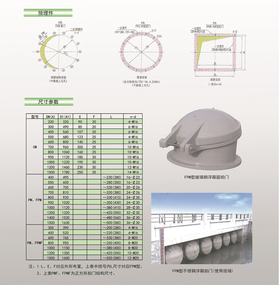 CM型为硬止水密封,经济耐用,若采用玻璃钢制造,无形中可防盗; PM型为橡胶软止水密封,效果好,耐冲击; FPM型门体在水中比重稍大于水,开启水头极小(重力抵消后约0.06m水头); 安装形式多为法兰结构,安装方便; 节省电能、人力、水处理费等。